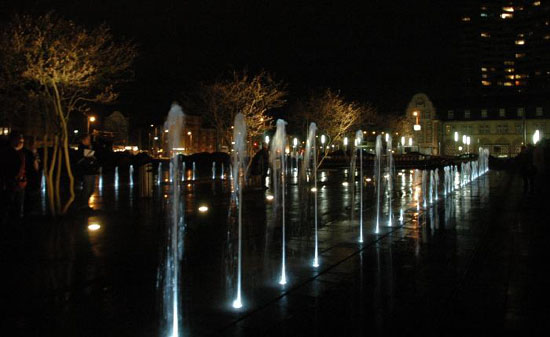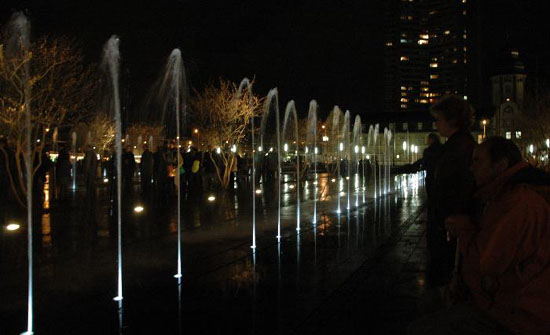Schon am Tage einzigartig, entfaltet der Springbrunnen bei Nacht durch die integrierte Beleuchtung seine ganze Faszination